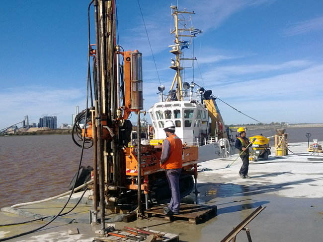 Construcción de bases fundadas en el lecho del Río Uruguay para soporte de la nueva estructura de carga en el puerto de la Zona Franca Nueva Palmira, Colonia.